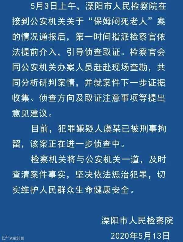 5月12日,江苏溧阳市公安局发布的警情通报。目前,虞某因涉嫌故意杀人罪被公安机关依法刑事拘留,案件正在进一步侦办中。