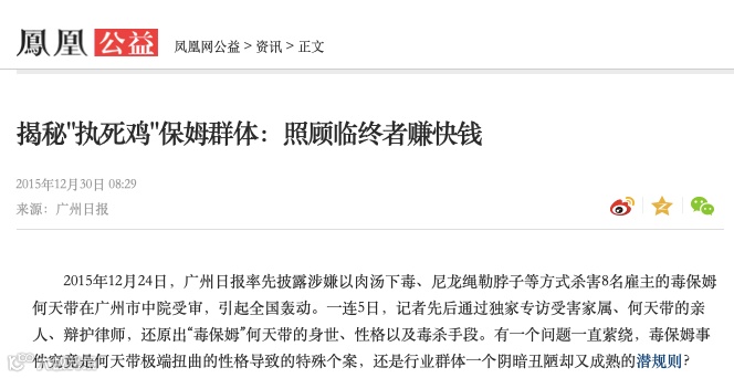 2015年12月24日,广州日报报道过涉嫌以肉汤下毒、尼龙绳勒脖子等方式杀害8名雇主的毒保姆何天带,在广州市中院受审,也是一个全国轰动的大案,对这个案子的报道揭开了一群保姆专门“执死鸡”的行业潜规则。