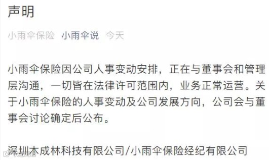 上午,一份署名为深圳木成林科技有限公司、小雨伞保险经纪有限公司的声明在“小雨伞说”上发布表示,小雨伞经纪因公司人事变动安排,正在与董事会和管理层沟通,一切皆在法律许可范围内,业务正常运营。关于小雨伞经纪的人事变动和公司发展方向,公司会与董事会讨论确定后公布。