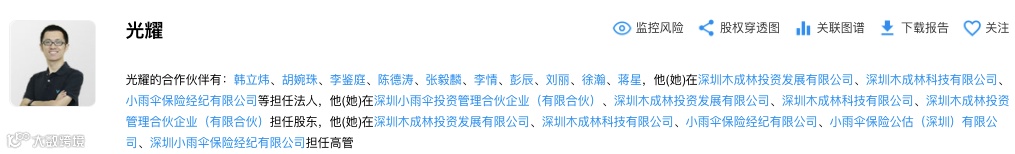 企查查显示,光耀是小雨伞经纪、深圳木成林科技有限公司的法人代表。深圳木成林科技有限公司是小雨伞经纪的全资股东。