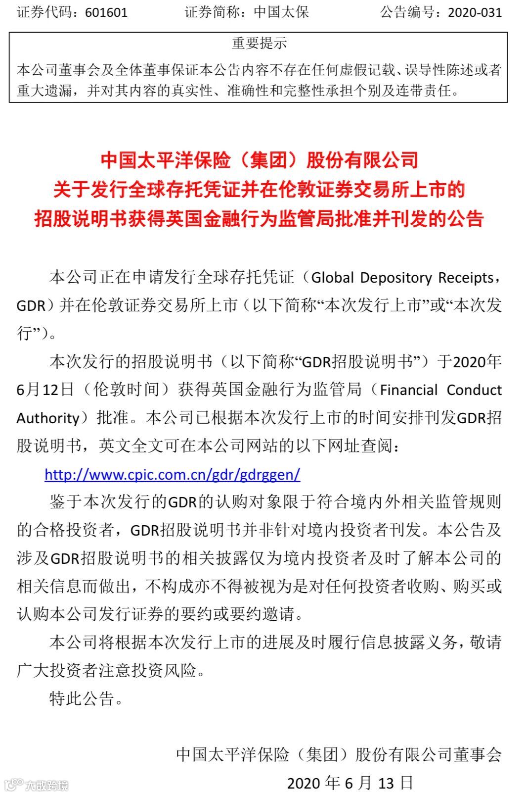 6月12日,中国太保在上交所、香港联交所及伦交所三大平台发布公告称,公司申请发行GDR并在伦交所上市的招股说明书已于伦敦时间6月12日获得英国金融行为监管局批准。