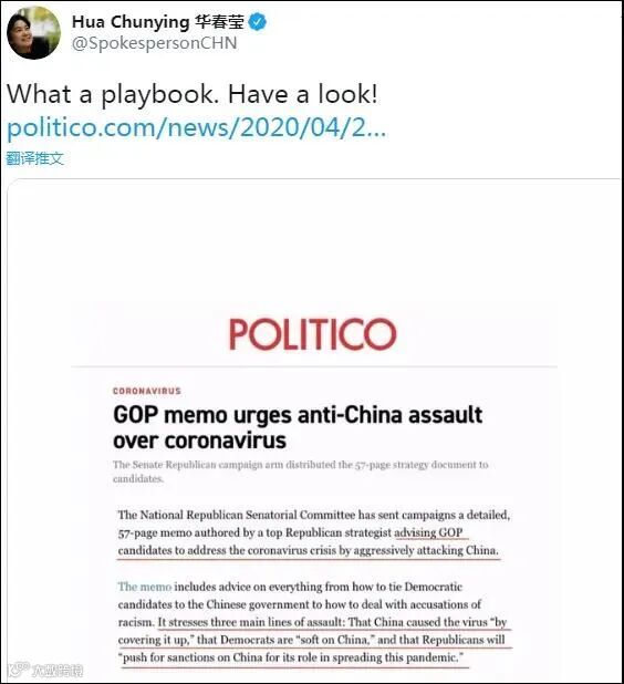 这份长达57页的备忘录强调了三条主要攻击路线,一是指责“中国掩盖疫情真相导致疫情蔓延”、二是攻击民主党人“对中国态度软弱”、三是共和党人将因中国导致疫情传播而推动对中国的制裁。备忘录还显示,共和党人有意在美国大选中继续炒作中国话题。