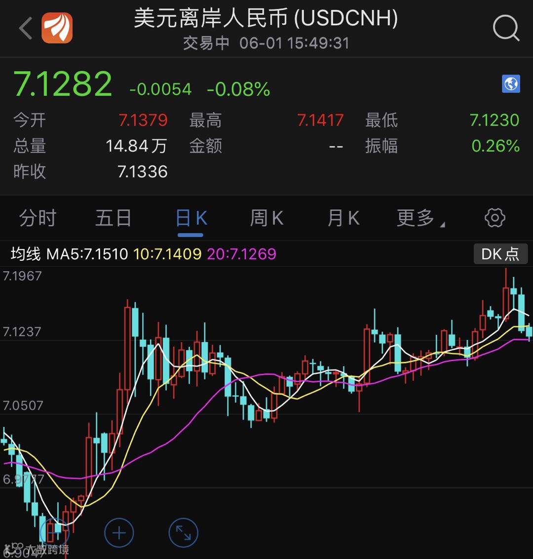 与此同时,离岸人民币近日重新转强,人民币兑美元近几个交易日最大涨幅近700点。不过,截至发稿时间,人民币仍有波折。
