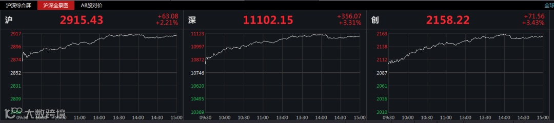 6月1日,A股收盘大涨。截至收盘,沪指涨2.21%,报收2915点;深成指涨3.31%,报收11102点;创业板指涨3.43%,报收2158点。