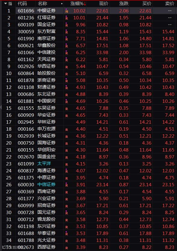 受T+0消息刺激,券商股实际上充当了定海神针的作用。券商板块今日全线大涨。
