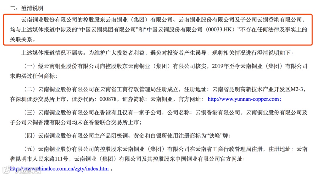 云南铜业在澄清公告中严正申明,公司控股股东云南铜业(集团)有限公司、公司本身及子公司云铜香港有限公司,均与有关媒体报道中涉及的“中国云铜集团有限公司”和“中国云铜股份有限公司(00033.HK)”不存在任何法律及事实上的关联关系。