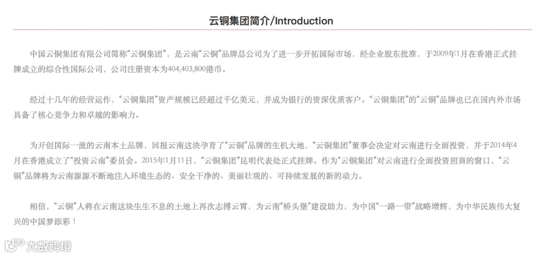 据该公司官网介绍,“云铜集团”全称中国云铜集团有限公司,是云南“云铜”品牌总公司为了进一步开拓国际市场,经企业股东批准,于2009年1月在香港正式挂牌成立的综合性国际公司,公司注册资本为4.04亿港币。