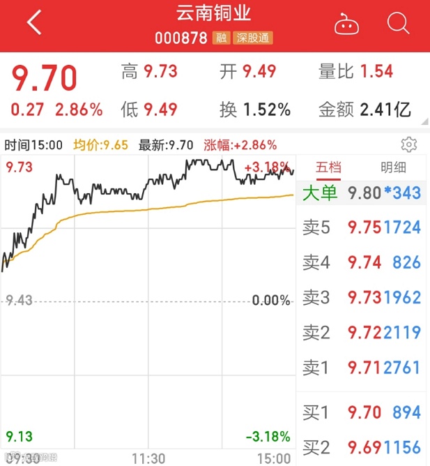 二级市场上,截至6月1日收盘,云南铜业上涨2.86%,报9.70元/股。