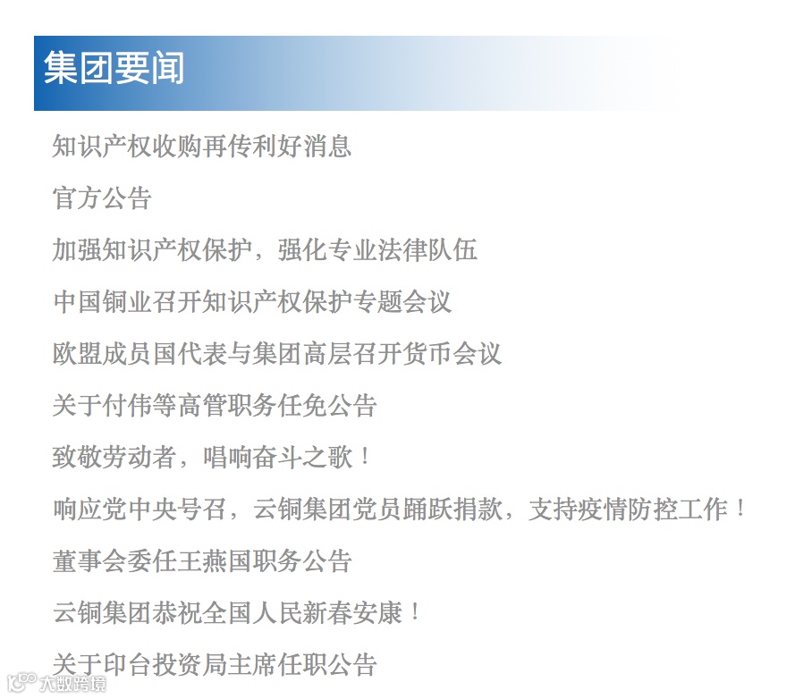 打开中国云铜集团官网,集团要闻前几条均显示与知识产权有关。