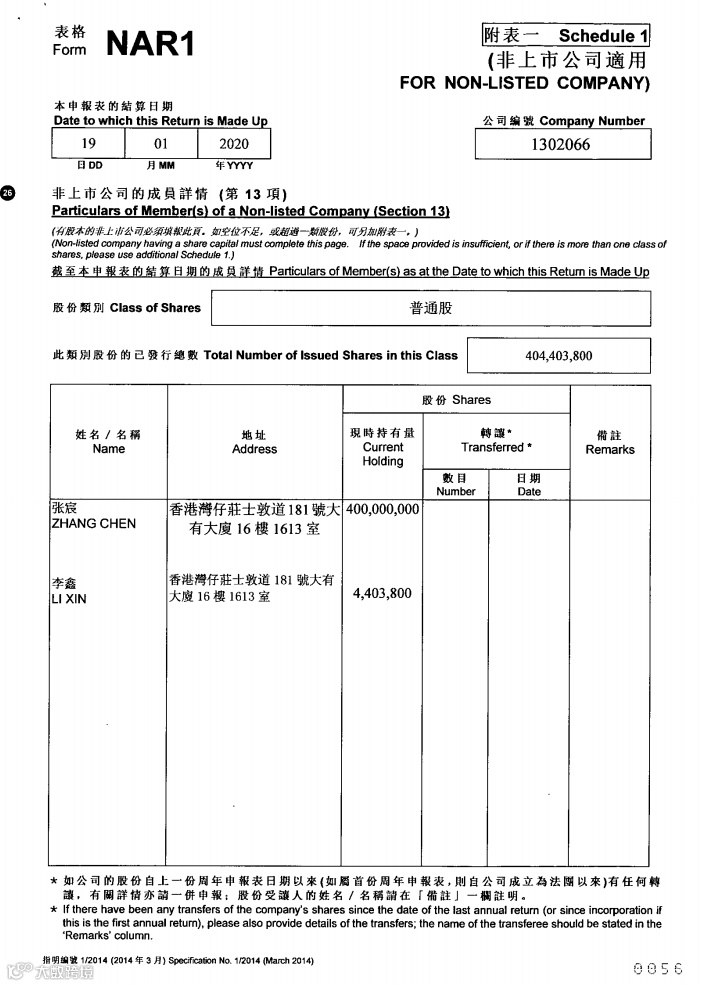 记者在香港公司注册处的网上查册中心查到这家公司的持有人是两名自然人。
