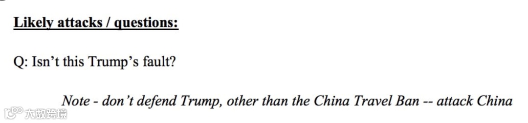 “别为特朗普辩解——除了他的中国旅行禁令,要攻击中国”,这份备忘录写道。