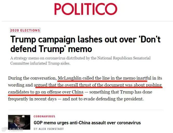 但尴尬的是,这份备忘录除了让共和党竞选美国国会参议院席位的政客们拼命栽赃中国“隐瞒疫情”,拼命要把美国民主党说成“私通中国”,还提醒共和党的竞选者们不要为美国总统特朗普进行辩护。