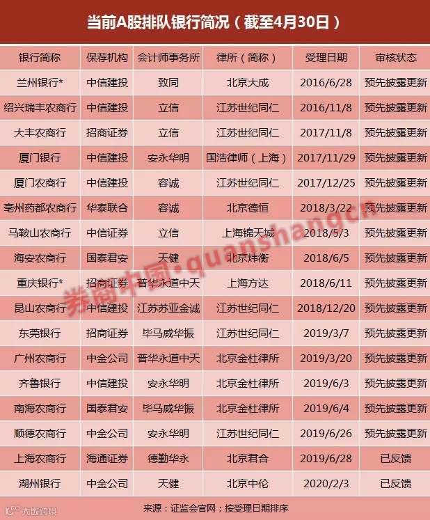 截至4月30日,当前有17家银行排队冲刺A股IPO,其中浙江绍兴瑞丰银行、厦门银行、厦门农商行、亳州药都农商行、江苏海安农商行、兰州银行、江苏大丰农商行、重庆银行、江苏昆山农商行、安徽马鞍山农商行、东莞银行、广州农商行、广东南海农商行、广东顺德农商行、齐鲁银行进入预披露更新;上海农商行、湖州银行已获反馈。