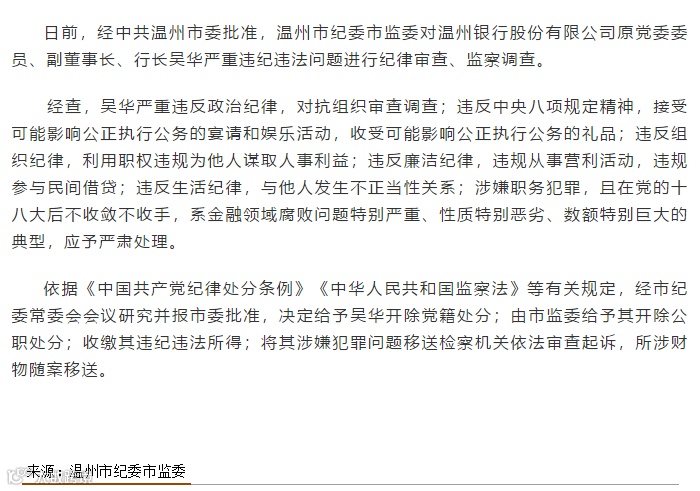 更早一天,浙江省纪委省监委网站官方微信公众号“清廉浙江”就发文称,经中共温州市委批准,温州市纪委市监委对温州银行股份有限公司原党委委员、副董事长、行长吴华严重违纪违法问题进行纪律审查、监察调查。