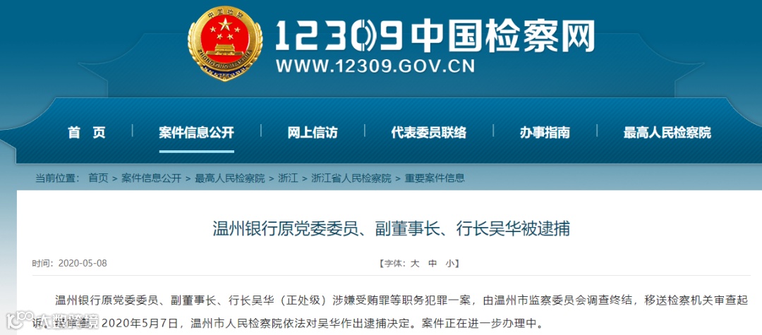 5月8日,中国检察网消息,温州银行原党委委员、副董事长、行长吴华(正处级)涉嫌受贿罪等职务犯罪一案,由温州市监察委员会调查终结,移送检察机关审查起诉。