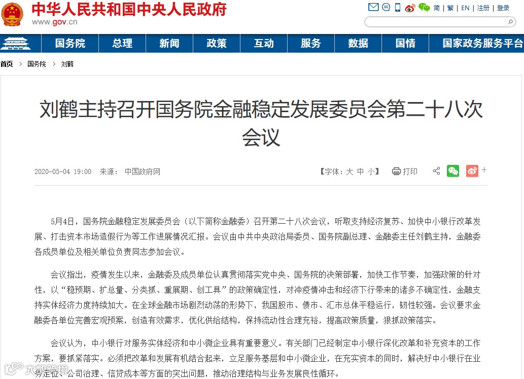 5月4日,国务院金融稳定发展委员会(以下简称金融委)召开第二十八次会议,听取支持经济复苏、加快中小银行改革发展、打击资本市场造假行为等工作进展情况汇报。会议由中共中央政治局委员、国务院副总理、金融委主任刘鹤主持,金融委各成员单位及相关单位负责同志参加会议。