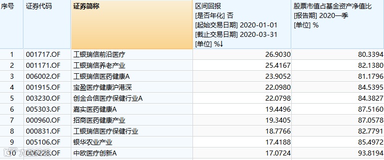 可以看到,今年一季度,公募基金收益TOP10几乎被医药医疗类主题基金占领。今年一季度的公募基金业绩冠军工银瑞信前沿医疗,一季度共计录得回报26.90%,领跑市场。据悉,本基金通过投资于前沿医疗领域中具有高成长性的优质上市公司,在风险可控的前提下力争获取超越业绩比较基准的收益。