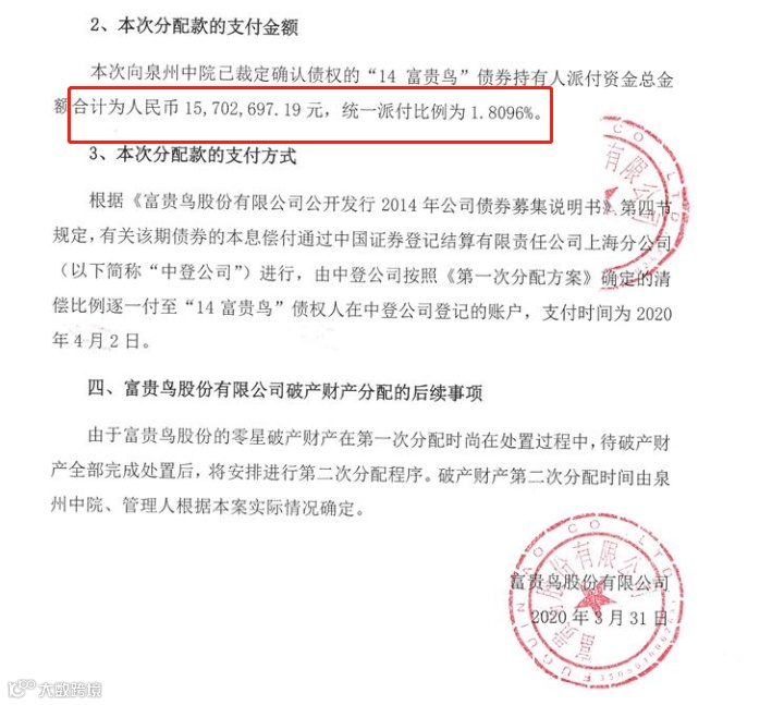 时间转到2020年,14富贵鸟的债权人清偿情况如何?4月2日,富贵鸟发布《关于向“14富贵鸟”债权人支付分配款的公告》。前期,国泰君安曾代出具书面授权的14富贵鸟债券持有人进行债权申报,合计持仓面值约8亿元,涉及63家债权人的63笔债权,经泉州中院确认8.68亿元普通债权。