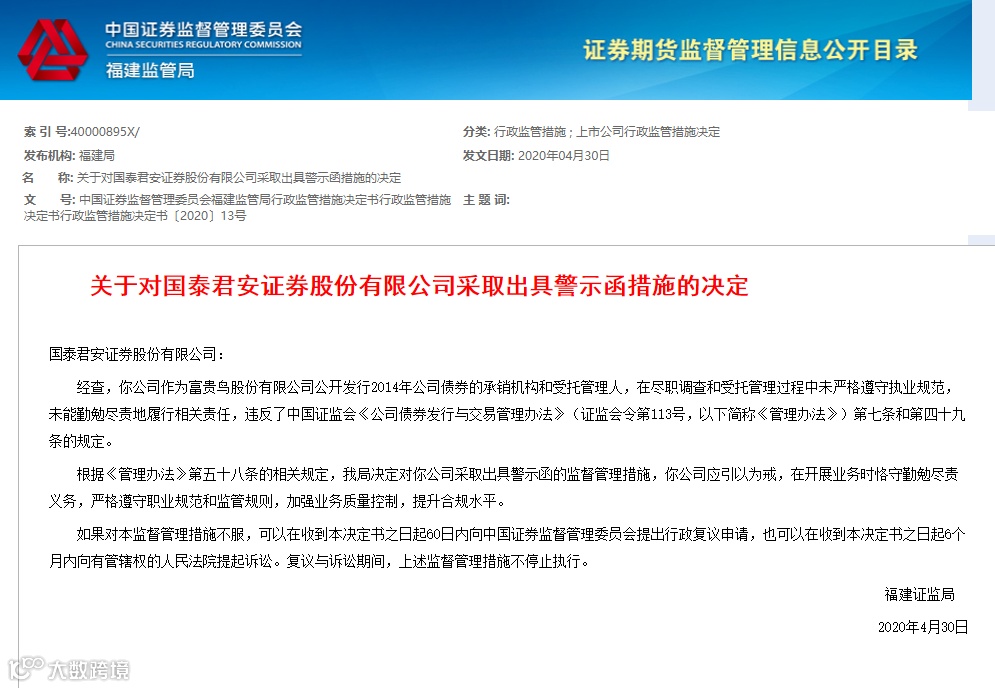 5月6日,福建证监局网站发布《关于对国泰君安证券股份有限公司采取出具警示函措施的决定》。福建证监局指出,国泰君安作为富贵鸟股份有限公司公开发行2014年公司债券的承销机构和受托管理人,在尽职调查和受托管理过程中未严格遵守执业规范,未能勤勉尽责地履行相关责任。