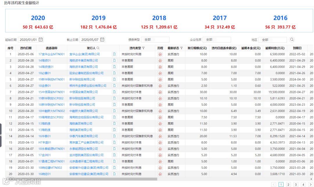 在2018年债券违约密集出现之后,市场对于“常态化”违约已见怪不怪。Wind数据显示,2019年共有182只债券违约,违约金额1476.04亿元;2020年至今,已有50只债券发生违约,合计金额达到643.63亿元。