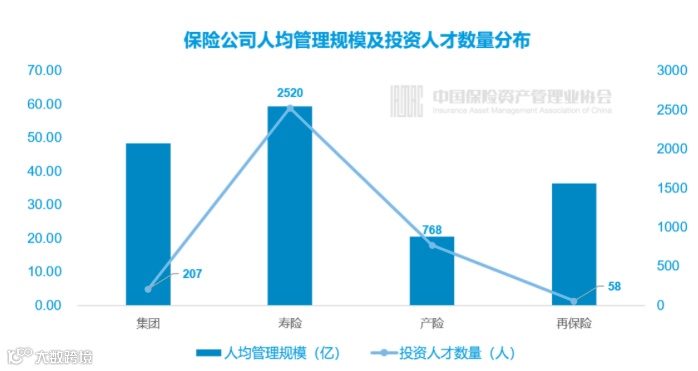 对应的投资管理部门人均管理规模为49.9亿元,较上一年增长18.7%。其中,寿险公司人均管理规模最大,其次为保险集团、再保险,产险的人均管理规模最低。