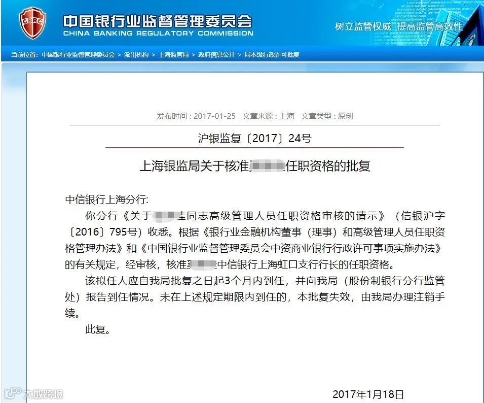 根据国家企业信用信息公示系统,中信银行上海虹口支行的负责人为奚某,系在2016年9月进行负责人变更登记。2017年1月,原上海银监局核准奚某上海虹口支行行长的任职资格。