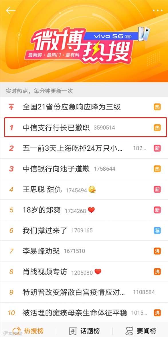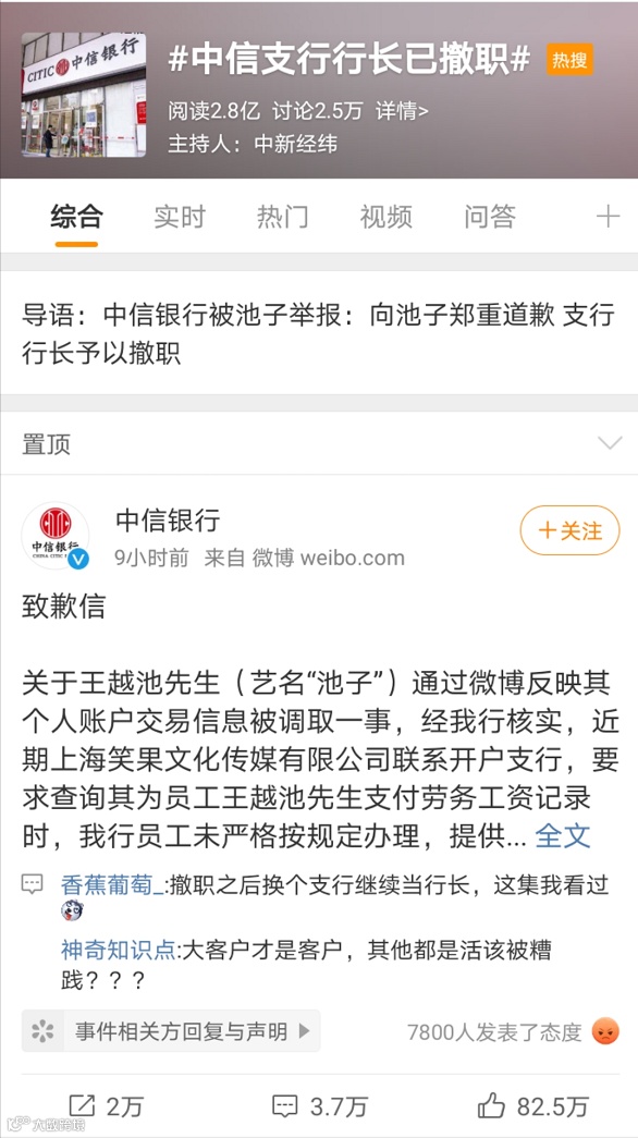 在哪里的战争,就在哪里解决。5月7日凌晨1点左右,中信银行官方微博发布道歉信。中信银行表示,“我行员工未严格按规定办理,提供了王越池的收款记录。对此,向王越池郑重道歉!”中信银行已按制度规定对相关员工予以处分,并对支行行长予以撤职。目前,这一消息已登上微博热搜榜第一名,且热度不断增加。