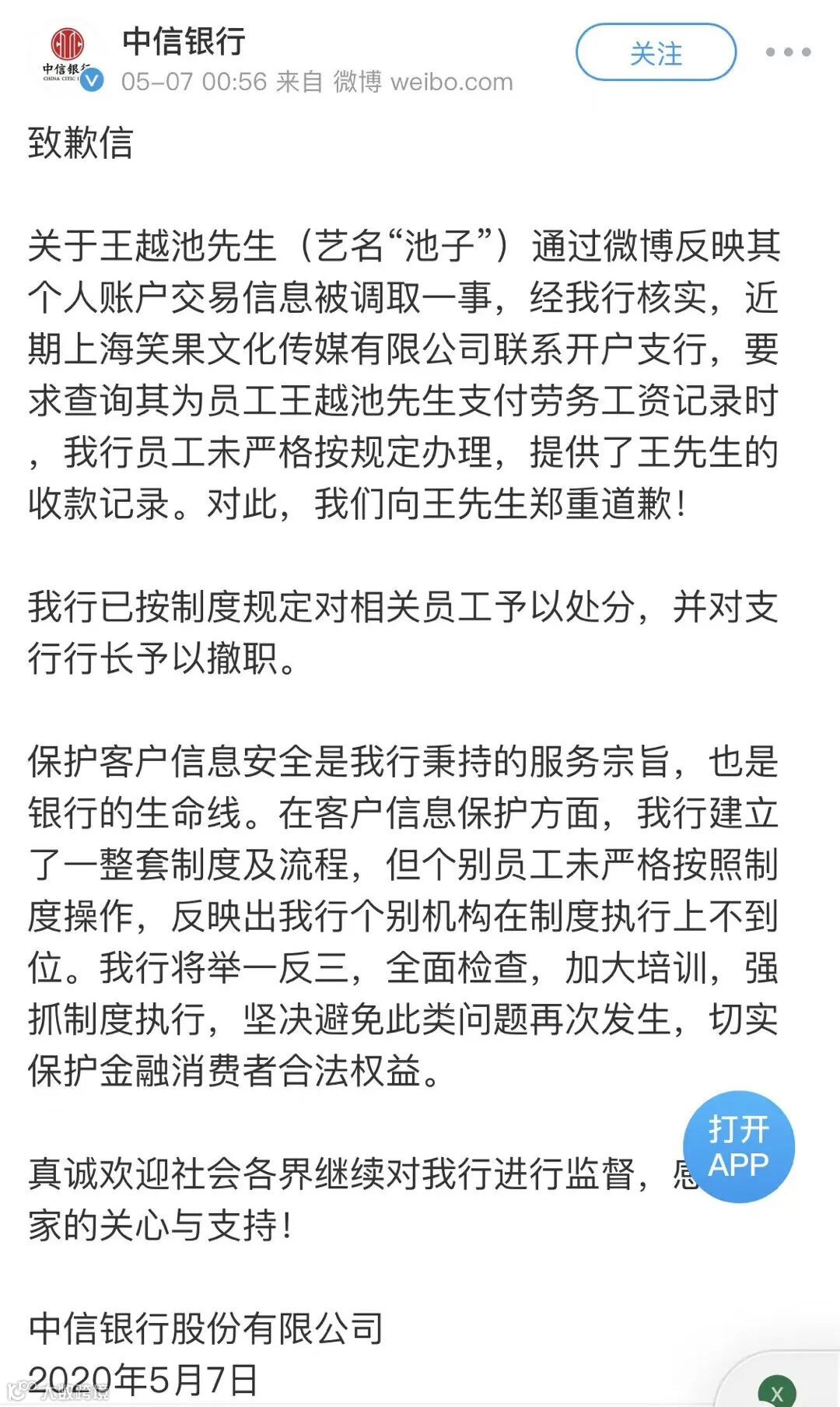 在致歉信中,中信银行表示,关于王越池(艺名“池子”)通过微博反映其个人账户交易信息被调取一事,经核实,近期上海笑果文化传媒有限公司联系开户支行,要求查询其为员工王越池支付劳务工资记录时,改行员工未严格按规定办理,提供了收款记录。