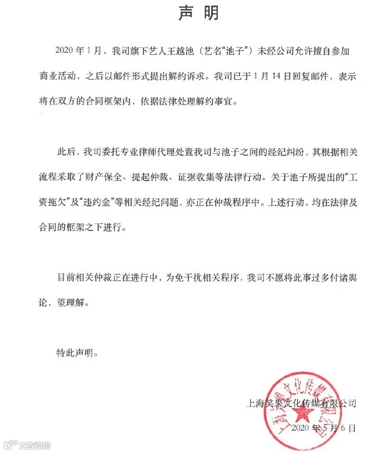 对此,5月6晚间,笑果文化在第一时间予以回应。在声明中,笑果文化提出池子在2020年1月“未经公司允许擅自参加商业活动”,之后以邮件形式提出解约诉求。公司已于1月14日回复邮件,表示将在双方合同框架内,依据法律处理解约事宜。