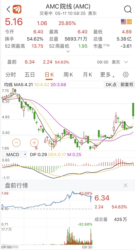 5月11日晚间,王健林旗下AMC院线美股盘前一度暴涨超80%!美股开盘后,AMC院线一度暴涨56%,随后,涨幅有所收窄,截至当晚11点左右,股价涨幅维持在25%左右。此前有报道称,亚马逊对AMC展开收购谈判。不过,晚些时候,花旗表示,亚马逊对AMC院线潜在的收购不太可能发生。