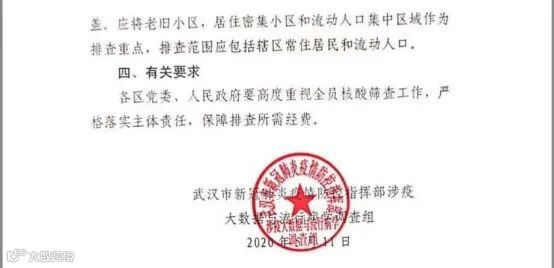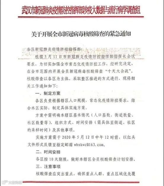 5月11日,一份武汉《关于开展全市新冠病毒核酸筛查的紧急通知》(下称“通知”)流出,经研究决定,在武汉全市范围内开展全员新冠病毒核酸筛查“十天大会战”。通知要求各区按10天期限,做好本辖区全员核酸筛查计划安排。