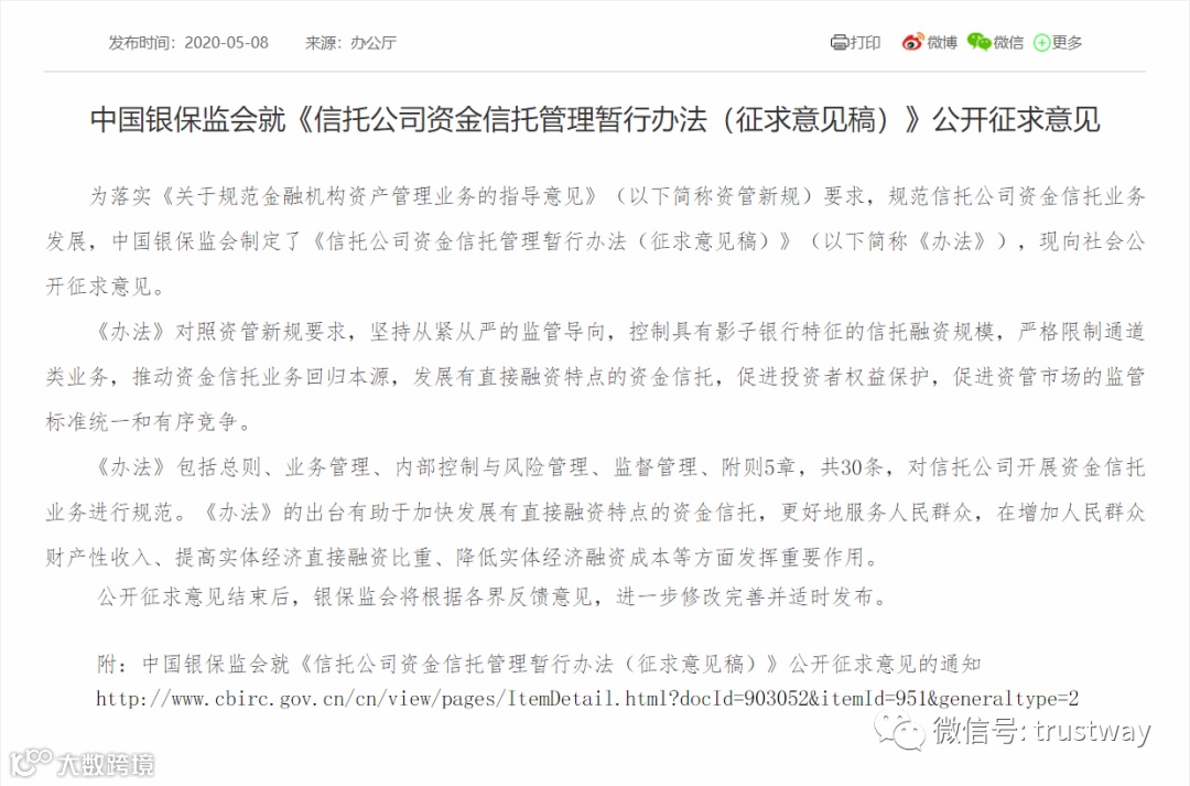 5月8日下午,银保监会发布《信托公司资金信托管理暂行办法(征求意见稿)》(简称《办法》),向社会公开征求意见。