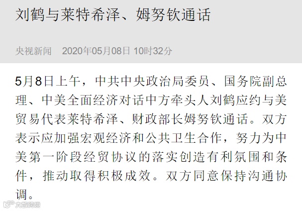 5月8日上午,中共中央政治局委员、国务院副总理、中美全面经济对话中方牵头人刘鹤应约与美贸易代表莱特希泽、财政部长姆努钦通话。双方表示应加强宏观经济和公共卫生合作,努力为中美第一阶段经贸协议的落实创造有利氛围和条件,推动取得积极成效。双方同意保持沟通协调。