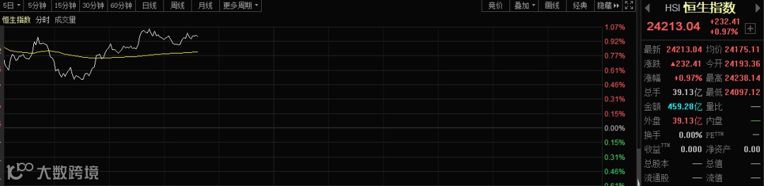 恒生指数涨幅亦扩大至1%附近。