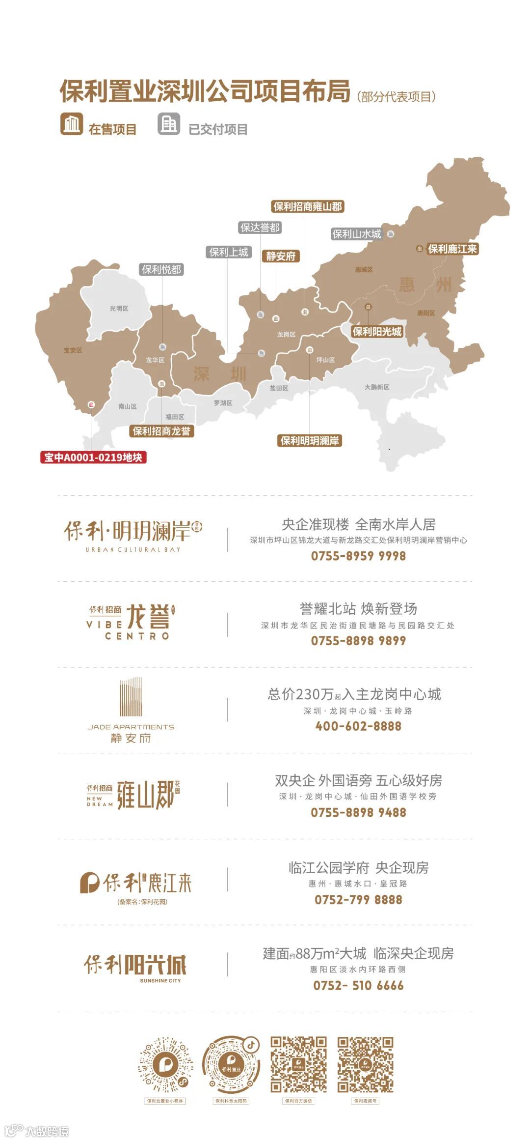 在保利置业“心安吾乡”品牌主张引领下,深圳公司在深惠两地成功打造了保利文化广场、保利上城、保利悦都、保利山水城、保利阳光城、保利鹿江来、保利勤诚达誉都、保利招商龙誉、保利明玥澜岸和保利招商雍山郡等一批优质项目,并荣获“最具影响力文化地产”、“安全文明管理和工程质量省双优奖”、“中国最美公共景观奖”等多个项目荣誉。截至目前为止,已累计服务近2万余个家庭,助力业主们实现安居梦想。