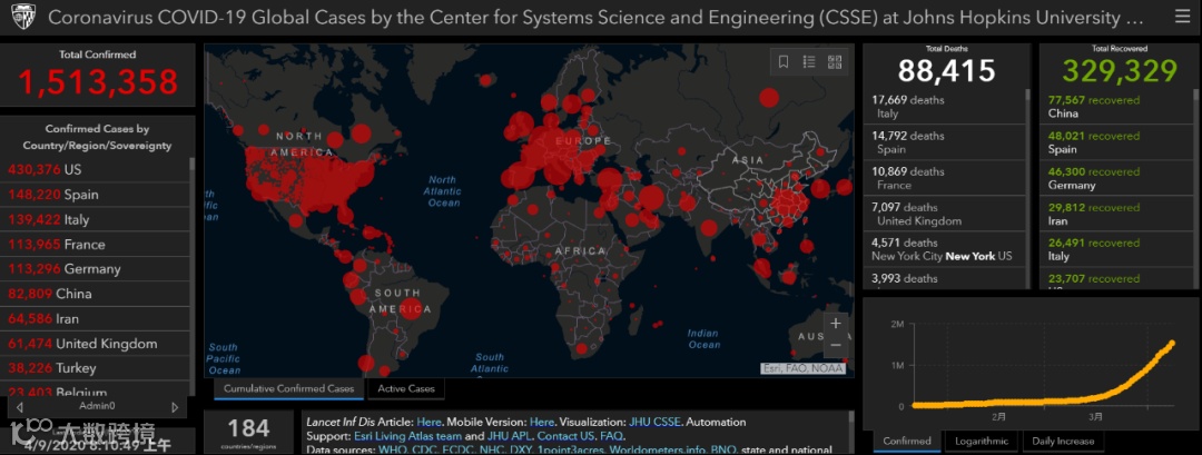 据美国约翰斯·霍普金斯大学实时疫情数据显示,截至北京时间4月9日上午8时,全球新冠肺炎累计确诊病例逾151万,达1513358例;累计死亡逾8.8万例;累计治愈近33万例。美国新冠肺炎累计确诊病例逾43万;累计死亡达1.48万例。目前,美国是全球累计确诊病例数最多的国家,死亡病例数反超西班牙,位居第二。
