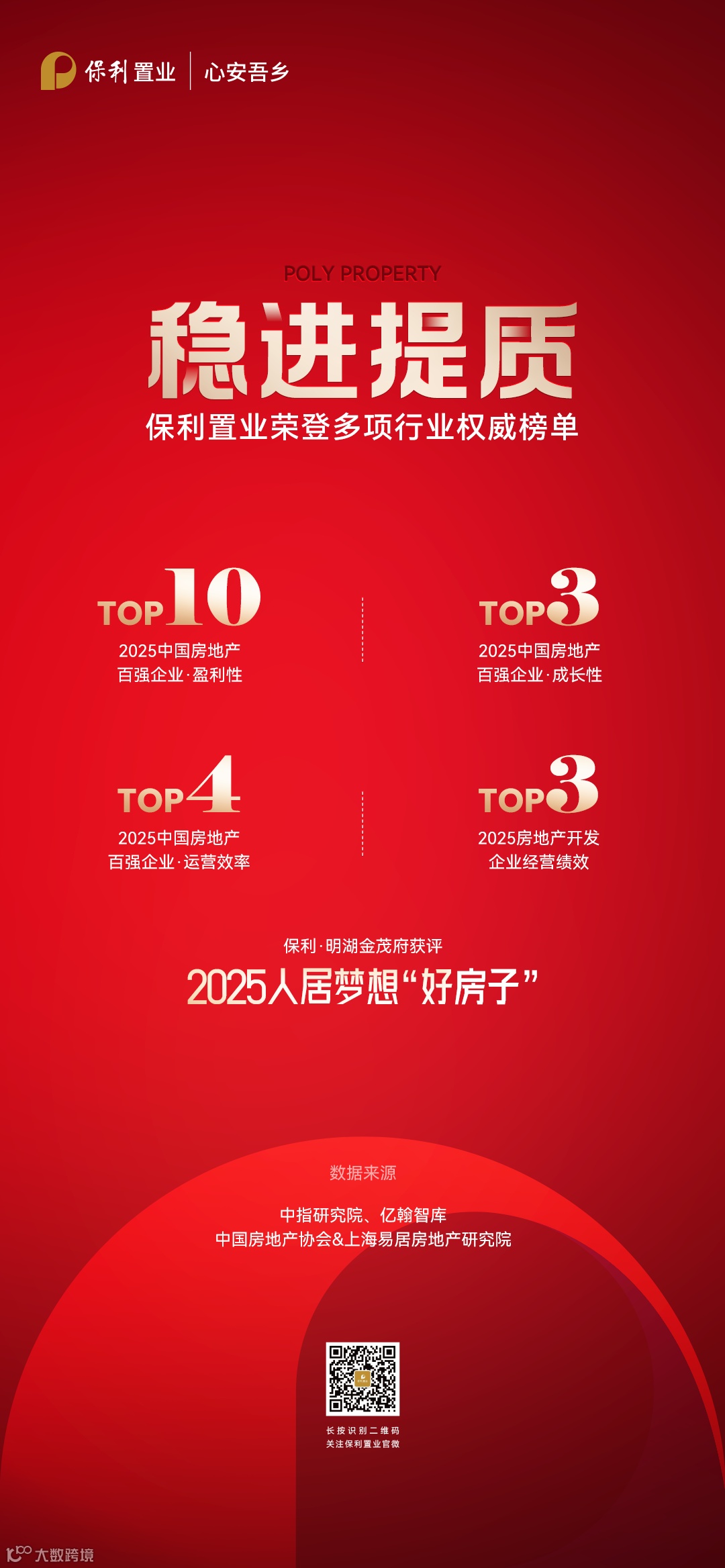 凭借前瞻的战略布局、稳健的经营质效及持续深化的产品服务创新力,保利置业再获权威认可,荣膺中指研究院《2025中国房地产百强企业》TOP20、盈利性TOP10、成长性TOP3、运营效率TOP4;保利明湖金茂府项目被评为“2025年人居梦想好房子”;位列亿翰智库《中国房企综合实力TOP100》第16位;斩获克而瑞“房地产开发企业经营绩效TOP3”“国企综合实力TOP15”。在行业调整周期中稳进提质,保利置业致力于夯实“好产品”“好服务”,助力人民实现心安吾乡的美好生活。