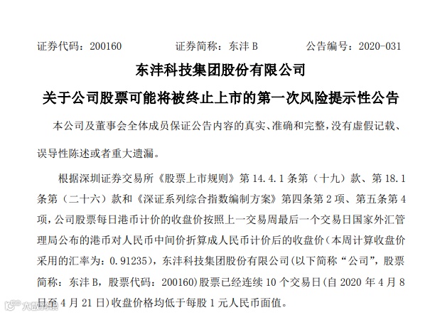 而局面更紧迫的上市公司则是B股板块的东沣B。公司21日晚间发布“可能将被终止上市的第一次风险提示性公告”。公告指出,东沣B股票已经连续10个交易日(自2020年4月8日至4月21日)收盘价格均低于每股1元人民币面值。公司股票可能将被终止上市。东沣B目前股价仅为0.74港元,按汇率折算后则为人民币0.68元,已经大幅低于1元的面值。