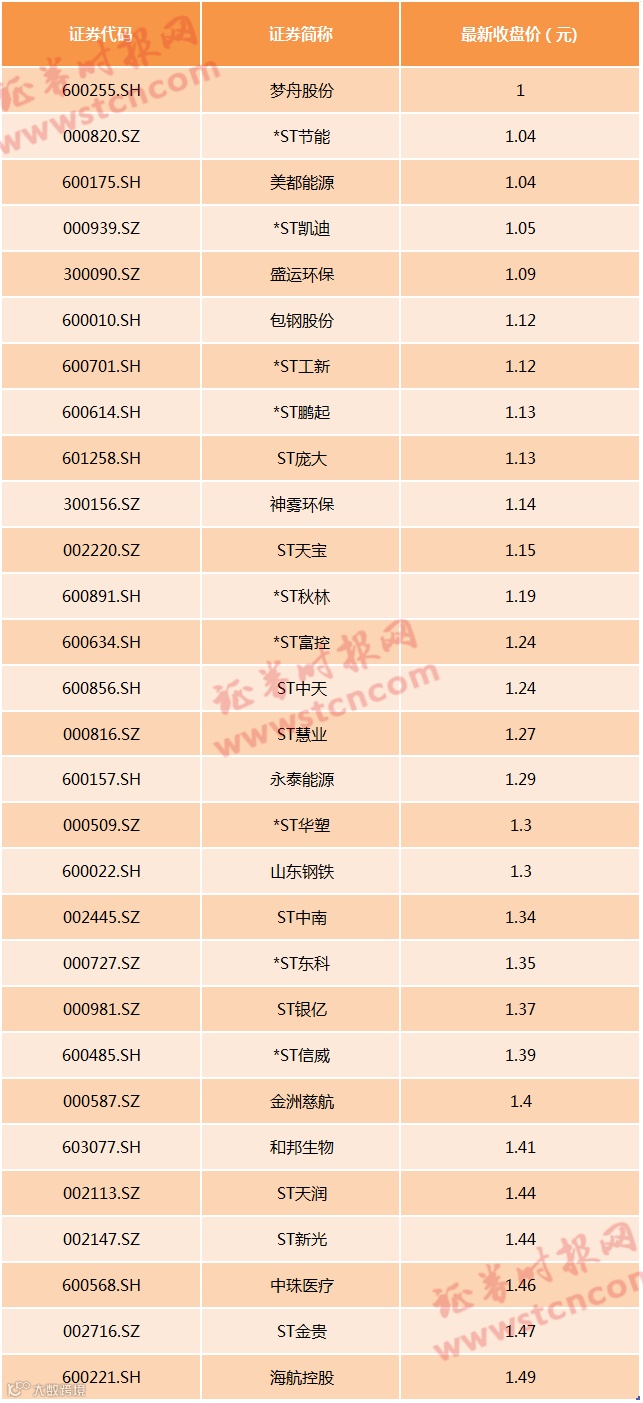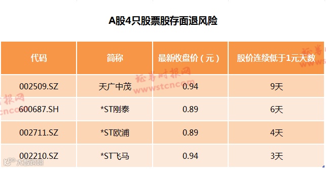 ST锐电退市流程尚未走完,A股面退的警钟再度敲响,时报君发现,截至目前,*ST欧浦、*ST刚泰、*ST飞马、天广中茂等4股股价已经连续多天低于1元。