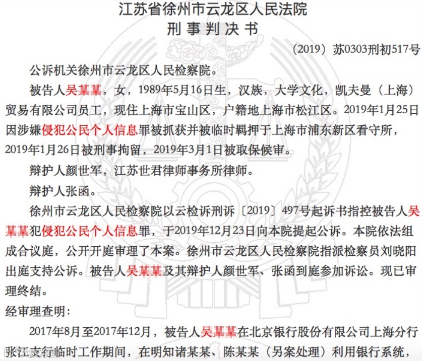 江苏省徐州市云龙区人民法院近日公布的刑事判决书显示,2017年8月至2017年12月,被告人吴某某在某城商行上海分行张江支行临时工作期间,在明知诸某某、陈某某(另案处理)利用银行系统,违规为闫某(另案处理)查询公民个人征信信息,提供给闫某收取费用的情况下,仍帮助诸某某、陈某某违规为闫某查询公民个人征信信息,并将查询的相关征信信息通过邮箱发送给闫某。截至案发,公安机关查证被告人吴某某共计向闫某提供公民个人征信信息830余条。