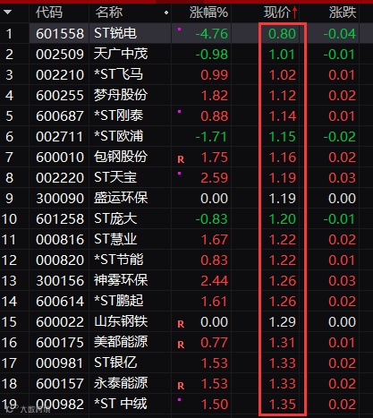 还有不少公司股价也徘徊在1元附近,离面值并不远,如果行情不佳,也存在连续跌破面值退市风险,这些公司包括天广中茂、*ST飞马等。