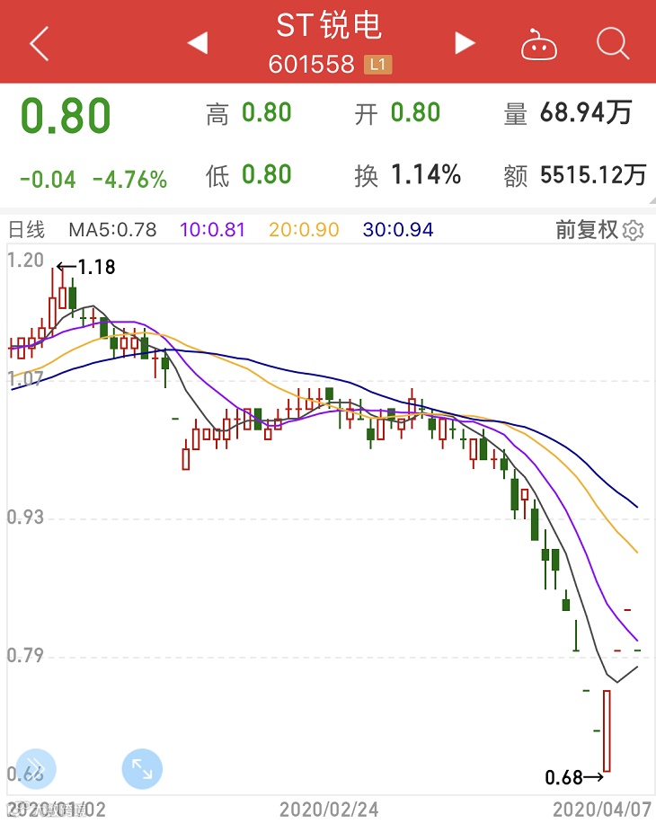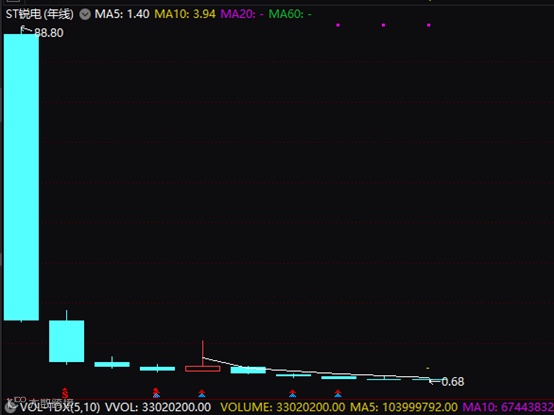 行情数据显示,截至今天收盘,ST锐电报0.80元,牢牢封死跌停,跌停板上封单超过2.1亿股。