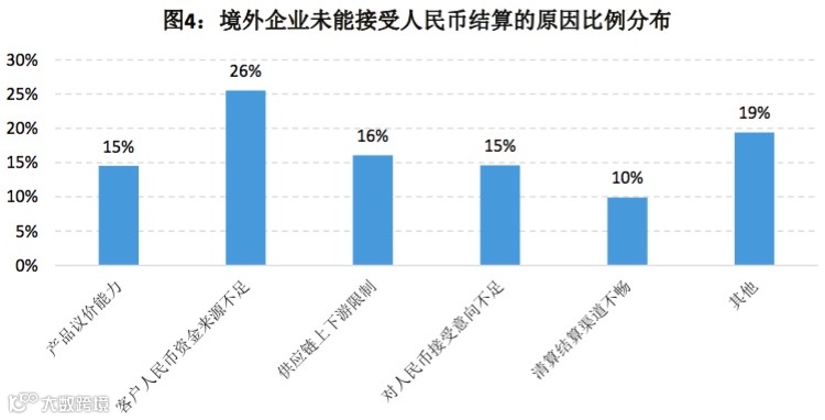 不过,报告指出,境外市场主体获得人民币便利性不足,这在一定程度上制约了其使用人民币结算。调查中,接近三成的受访境内企业称,其境外贸易伙伴缺乏人民币来源,导致其无法使用人民币进行支付。
