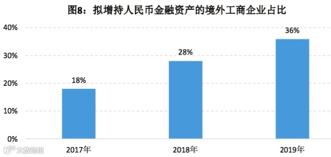 从持有人民币金融资产的偏好来看,近四成受访境外工商企业拟增持人民币债券资产。与2018年的调查结果相比,增持人民币债券和股票资产的受访境外工商企业占比明显上升。
