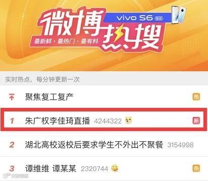 微博话题#朱广权李佳琦直播#阅读量突破3.3亿,迅速登上热搜第一位,持续霸榜4小时以上。