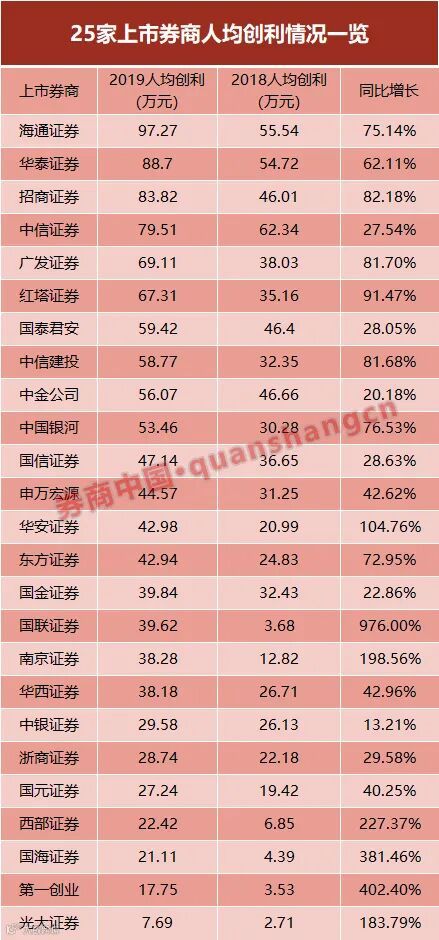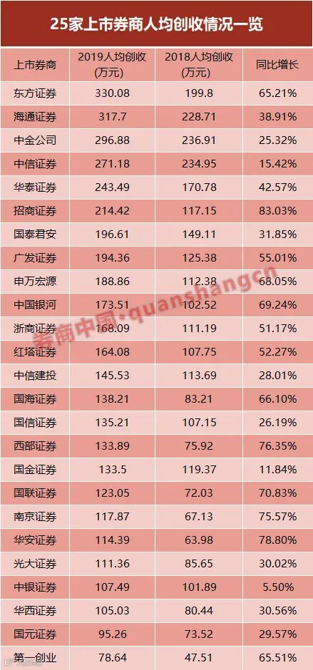 就人均创收情况来看,这25家上市券商中,有23家人均创收超100万,东方证券以330.08万元拔得头筹;人均创利来看,海通证券以97.27万元夺得头名。