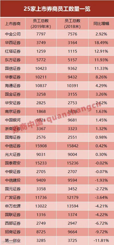2019年虽然行情好转,但是各家券商并非都在招兵买马,25家券商中有15家员工人数增加,其中一些后劲十足的中型券商诸如华西证券、红塔证券等增加一成以上,东方证券、国信证券、华泰证券等头部券商增员同样在一成左右。另外也有10家券商处于整体减员的状态,比如第一创业证券去年减员了440人,减幅超过11%;招商证券、西部证券整体减员也超过5%。