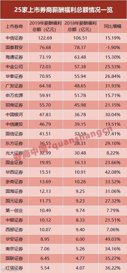就已发放和计提的薪酬总额来看,中信证券、国泰君安、海通证券、中金公司、华泰证券暂居前五,单家公司薪酬福利总额均超70亿元。其中中信证券2019年的员工薪酬总额为122.69亿元,高居榜首。