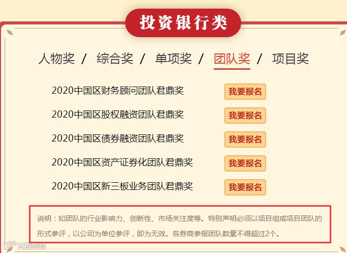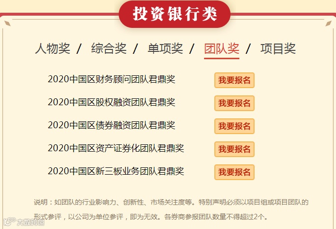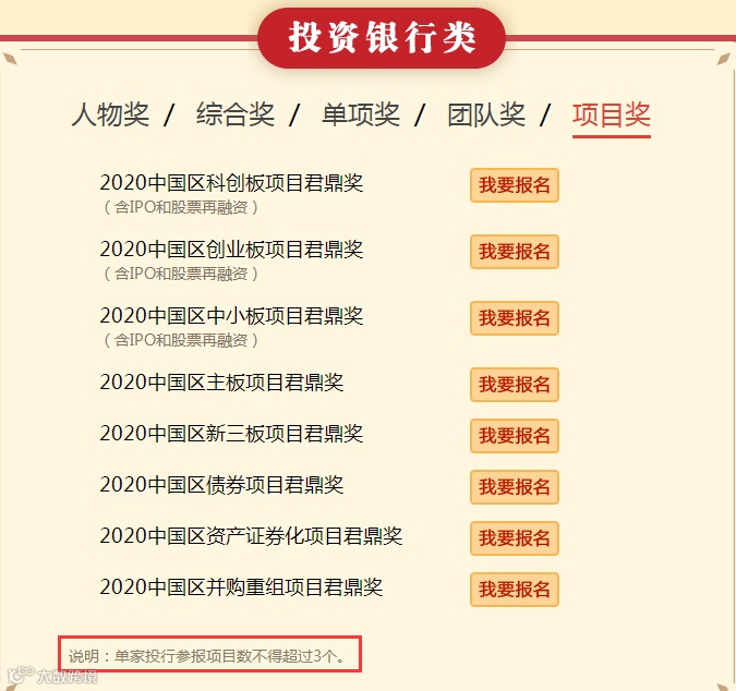 另外,单个奖项(如项目奖、团队奖)的具体个数有要求。以投资银行类的项目奖为例,科创板项目君鼎奖最多可以提交3个项目,同时创业板项目君鼎奖、中小板项目君鼎奖等都可以提交不超过3个项目。