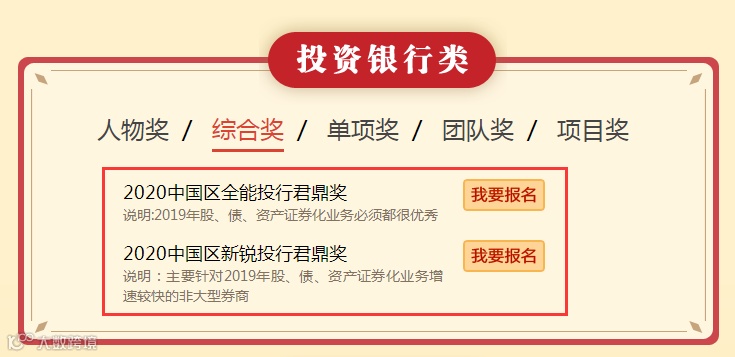 “中国区投资银行&证券经纪商君鼎奖”评选活动已经举办十二届,面向中国区从事证券交易、投资银行业务的本土、合资证券公司及投资银行,今年新增了科创板的相关奖项,在科创板承销保荐上有着不俗表现的投行,可以多关注相关奖项。